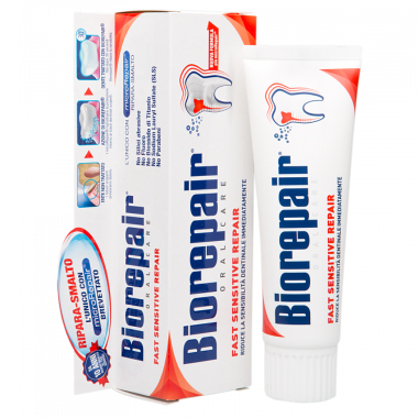 Паста Biorepair Fast Sensitive Repair (зубная паста «Быстрое восстановление» для чувствительных зубов) предназначена для защиты и укрепления чувствительных зубов при ежедневном использовании.