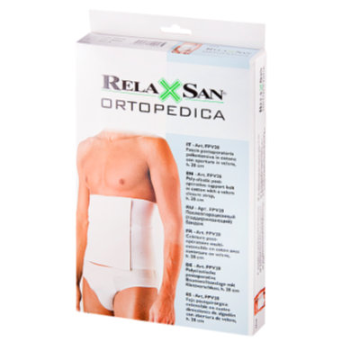 Поддерживающий послеоперационный бандаж (пояс) FPV28 применяется после полостных операций на брюшной полости до полного выздоровления. Бандаж фиксирует послеоперационные швы, не позволяя им расползаться, препятствует образованию послеоперационной грыжи и поддерживает брюшную стенку после операции. Хлопковая нить находится во внутреннем слое в непосредственном контакте с кожей, что придает изделию мягкость и комфорт. Широкая удобная липучка помогает закрепить пояс на талии максимально удобно. Бандаж надевается непосредственно на тело.