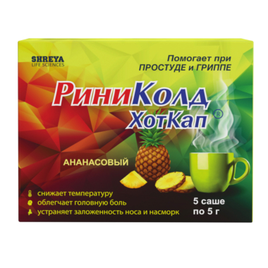 Содержимое 1 саше (пакетика) высыпать в стакан, залить горячей водой, перемешать до полного растворения и выпить (по желанию можно добавить сахар или мед). Принимать препарат РиниКолд ХотКап® необходимо с большим количеством жидкости, через 1-2 часа после приема пищи.