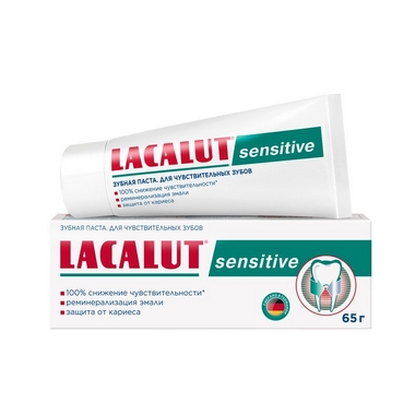 Зубная паста Lacalut sensitive уменьшает повышенную чувствительность к раздражителям (горячее, холодное, кислое, сладкое и другие). Двойная комбинация фторидов способствует реминерализации эмали, снижая болезненную чувствительность зубов и защищая от кариеса.