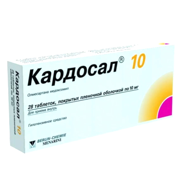 Кардосал - - специфический антагонист рецепторов ангиотензина II (типа AT1) для приема внутрь. Ангиотензин II является первичным вазоактивным гормоном ренин-ангиотензин-альдостероновой системы и играет значимую роль в патофизиологии артериальной гипертензии посредством AT1-рецепторов. Предполагается, что олмесартан блокирует все действия ангиотензина II, опосредованные AT1-рецепторами независимо от источника и пути синтеза ангиотензина II. При артериальной гипертензии олмесартан вызывает дозозависимое продолжительное снижение АД. Нет данных о развитии артериальной гипотензии после приема первой дозы препарата и о развитии синдрома отмены (резкое повышение АД после отмены препарата). Прием олмесартана медоксомила 1 раз/сутки обеспечивает эффективное и мягкое снижение АД в течение 24 ч, причем эффект после однократного приема аналогичен эффекту от приема препарата 2 раза в сутки в той же самой суточной дозе. Гипотензивное действие олмесартана развивается, как правило, уже через 2 недели, а максимальный эффект развивается приблизительно через 8 недель после начала терапии.