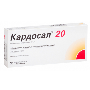 Кардосал - - специфический антагонист рецепторов ангиотензина II (типа AT1) для приема внутрь. Ангиотензин II является первичным вазоактивным гормоном ренин-ангиотензин-альдостероновой системы и играет значимую роль в патофизиологии артериальной гипертензии посредством AT1-рецепторов. Предполагается, что олмесартан блокирует все действия ангиотензина II, опосредованные AT1-рецепторами независимо от источника и пути синтеза ангиотензина II. При артериальной гипертензии олмесартан вызывает дозозависимое продолжительное снижение АД. Нет данных о развитии артериальной гипотензии после приема первой дозы препарата и о развитии синдрома отмены (резкое повышение АД после отмены препарата). Прием олмесартана медоксомила 1 раз/сутки обеспечивает эффективное и мягкое снижение АД в течение 24 ч, причем эффект после однократного приема аналогичен эффекту от приема препарата 2 раза в сутки в той же самой суточной дозе. Гипотензивное действие олмесартана развивается, как правило, уже через 2 недели, а максимальный эффект развивается приблизительно через 8 недель после начала терапии.