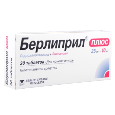 препарат Берлиприл Плюс 10/25 обладает антигипертензивным и диуретическим действием. Эналаприл и гидрохлоротиазид применяют для лечения при АГ отдельно и в комбинации — в последнем случае их антигипертензивные эффекты суммируются. Эналаприл снижает потери калия, вызванные гидрохлоротиазидом.
